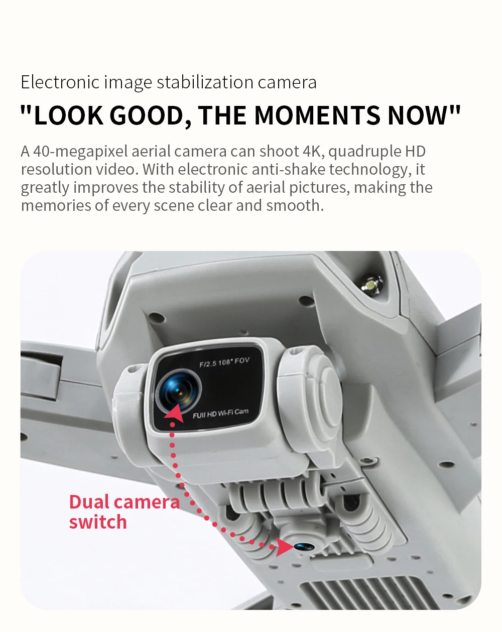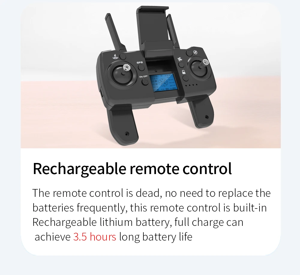– GPS Assisted Flight. Provides you with accurate positioning details of your drone.The drone will automatically return to home precisely when its battery is low or the signal is weak when flying out of range, never worrying about losing the drone.